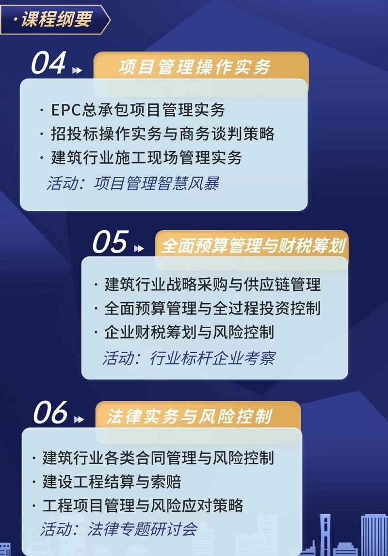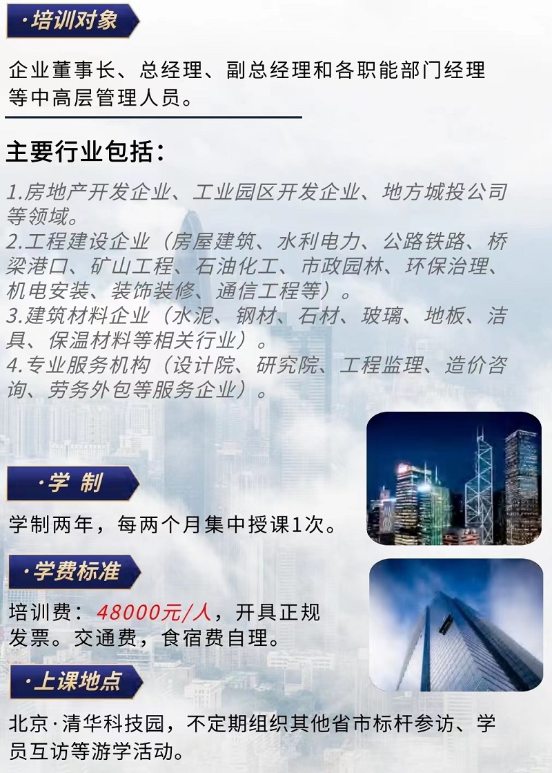 | 招生对象 | 建筑施工企业董事长、总经理、副总经理和各职能部门经理等中高层管理人员 |