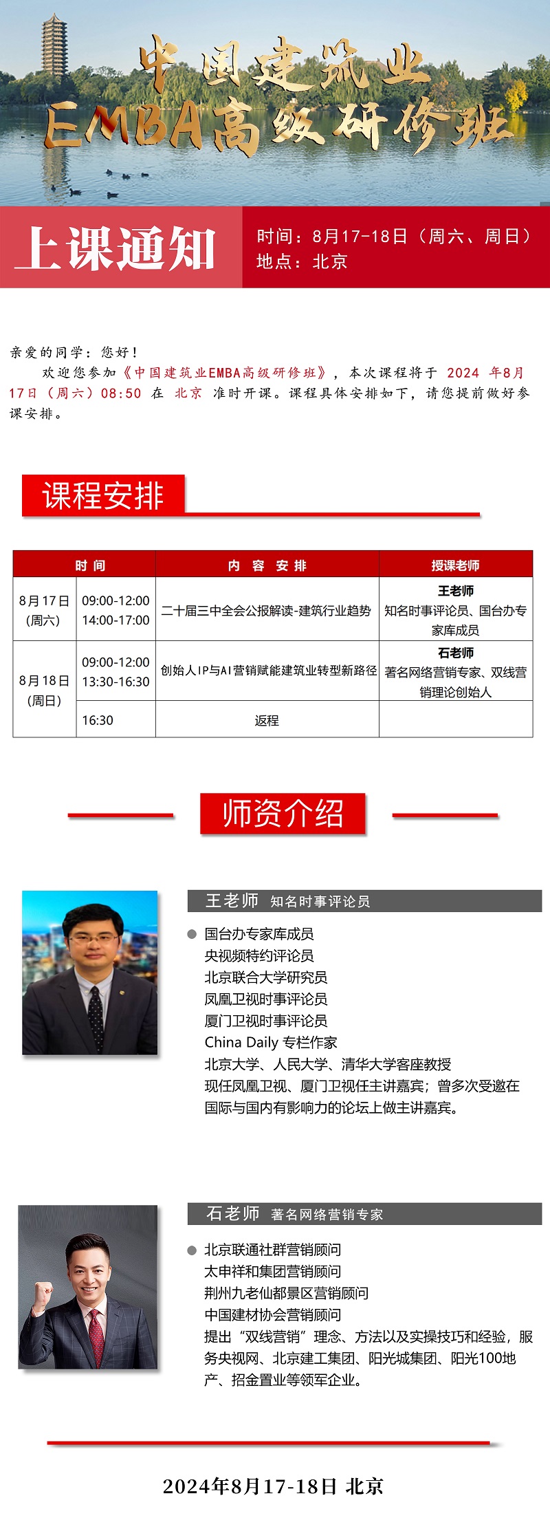 2024年8月17日中国建筑业EMBA高级研修班上课通知
