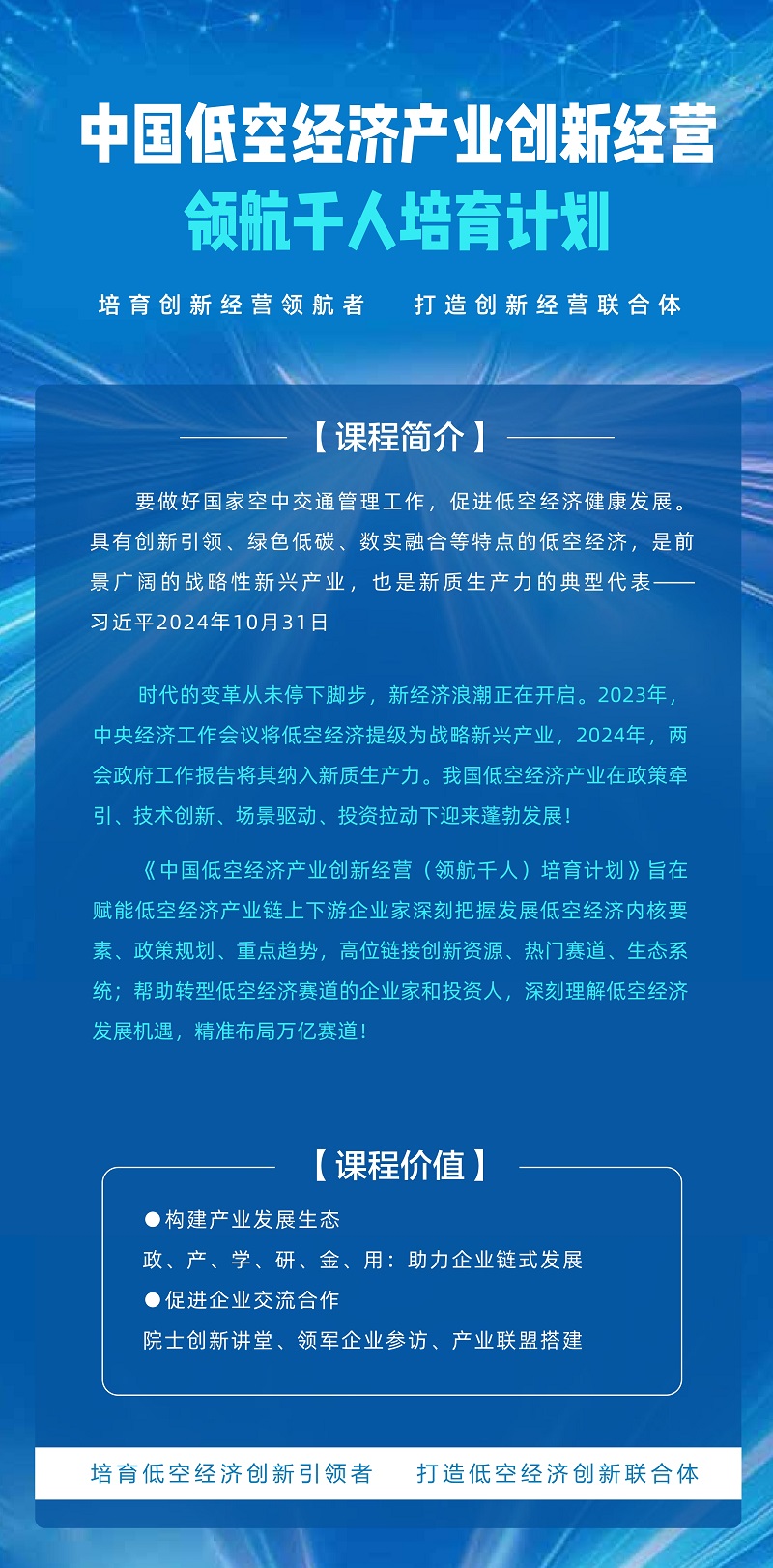 | 招生对象 | 低空基础设施、飞行器制造、通讯及运营服务、低空经济产业应用、飞行保障产业链、上下游企业负责人及机构投资人 |