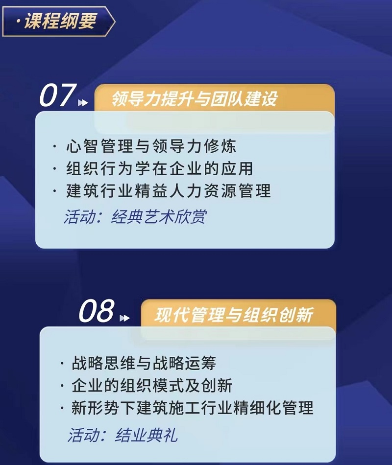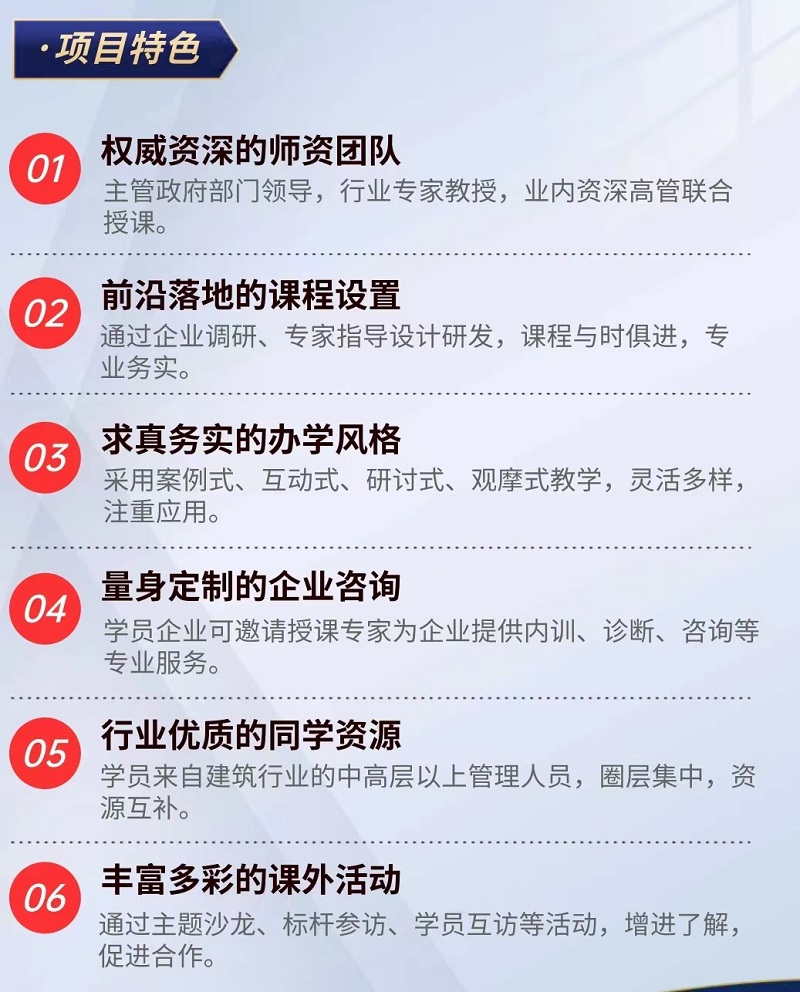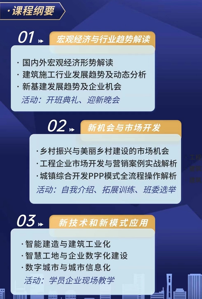 | 招生对象 | 建筑施工企业董事长、总经理、副总经理和各职能部门经理等中高层管理人员 |